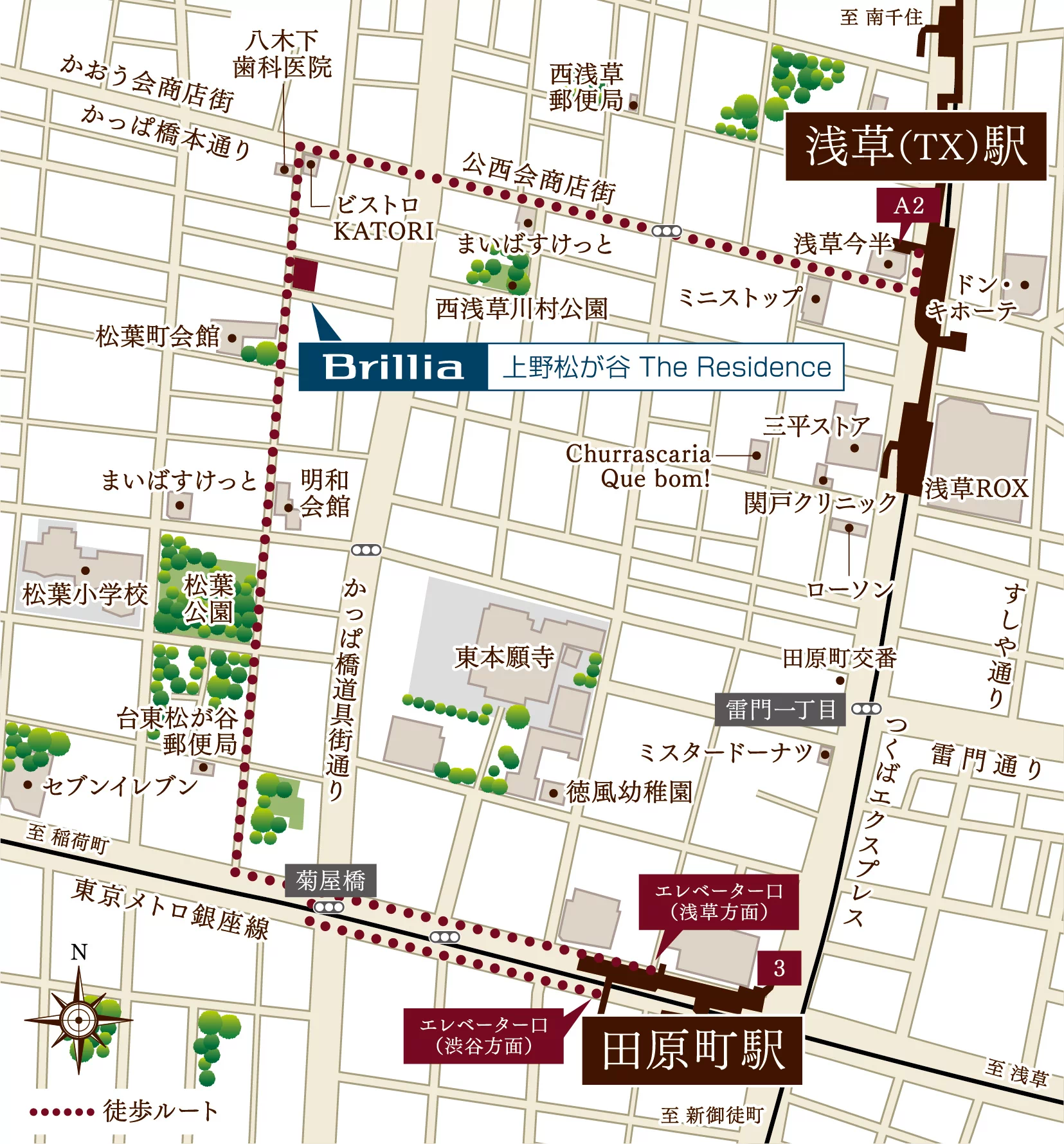 東京メトロ銀座線「田原町」駅(渋谷方面)徒歩8分・(浅草方面)徒歩9分、つくばエクスプレス「浅草」駅徒歩7分